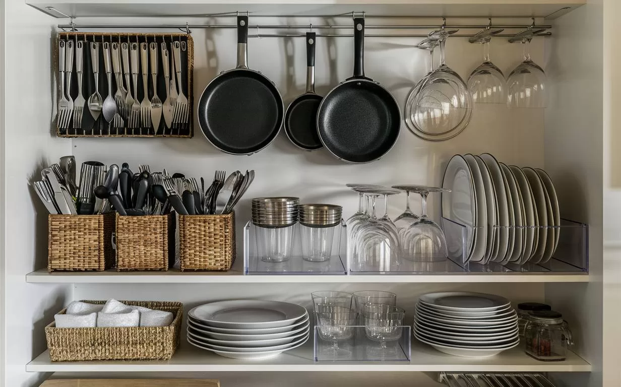 - Agrupe itens semelhantes juntos, como talheres, panelas, copos e pratos.
