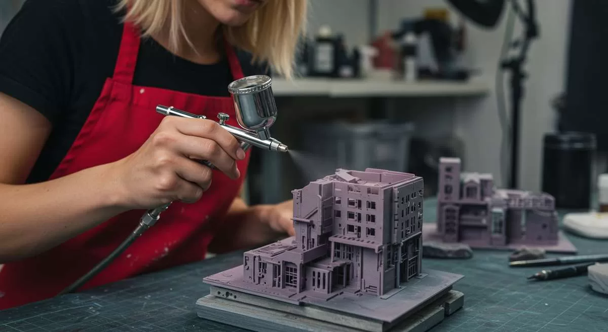 (Sugestão de imagem: Mãos habilidosas utilizando um aerógrafo para pintar uma peça 3D com detalhes, mostrando a névoa fina de tinta. Pode-se incluir o kit de aerógrafo discretamente ao fundo.)