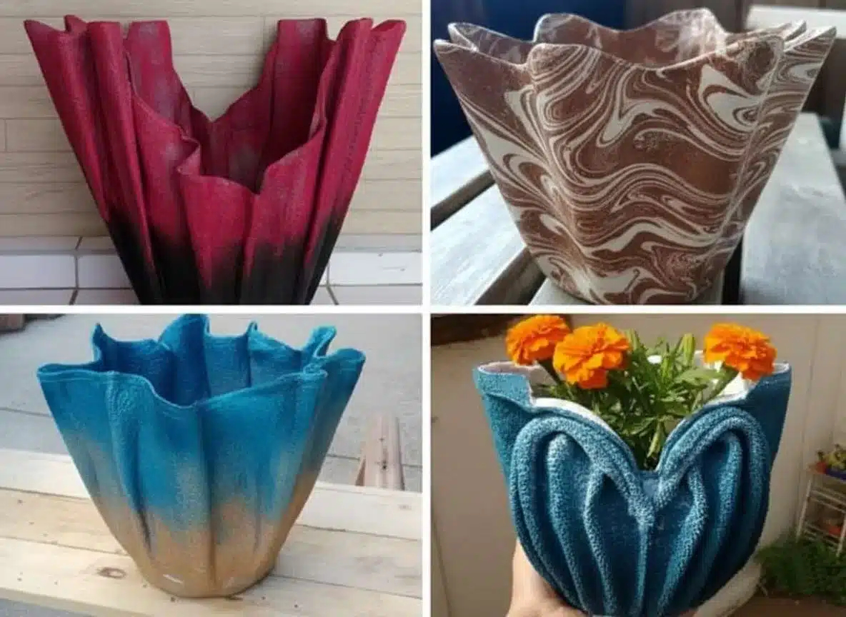 Faça um vaso básico e, após curado, aplique uma segunda toalha menor embebida em argamassa colorida com pigmento. Cria profundidade visual interessante.